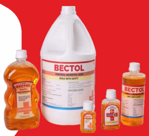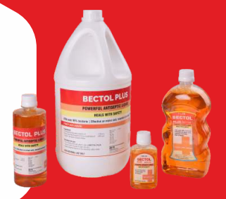 BECTOL First Aid Antiseptic Solution Packing Size 100 ml, 500 ml, 1 lit, 5 lit. INGREDIENTS CHLORHEXIDINE GLUCONATE SOLUTION IP – 0.3% v/vSTRONG CETRIMIDE SOLUTION BP – 0.6% w/v(Eq. to CETRIMIDE IP)Colour : Tartrazine & Sunset Yellow DIRECTION FOR USE For all kind of first aid, dilute 1 part of Bectol (by vol.) with 3 parts of water (by vol.) Apply prepared solution on the wound by cotton swab. APPLICATION The antiseptic solution that heals with safety. Effective on minor cuts, wounds & bruises. Kills over 99% bacteria. Non stinging. BECTOL PLUS First Aid Antiseptic Solution Packing Size 100 ml, 500 ml, 1 lit, 5 lit. INGREDIENTS CHLORHEXIDINE GLUCONATE SOLUTION IP – 1.5% v/vSTRONG CETRIMIDE SOLUTION BP – 3.0% w/v(Eq. to CETRIMIDE IP)Colour : Tartrazine & Sunset Yellow DIRECTION FOR USE For all kind of first aid, dilute 1 part of Bectol Plus (by vol.) with 15 parts of water (by vol.) Apply prepared solution on the wound by cotton swab. APPLICATION The antiseptic solution that heals with safety. Effective on minor cuts, wounds & bruises. Kills over 99% bacteria. Non stinging.